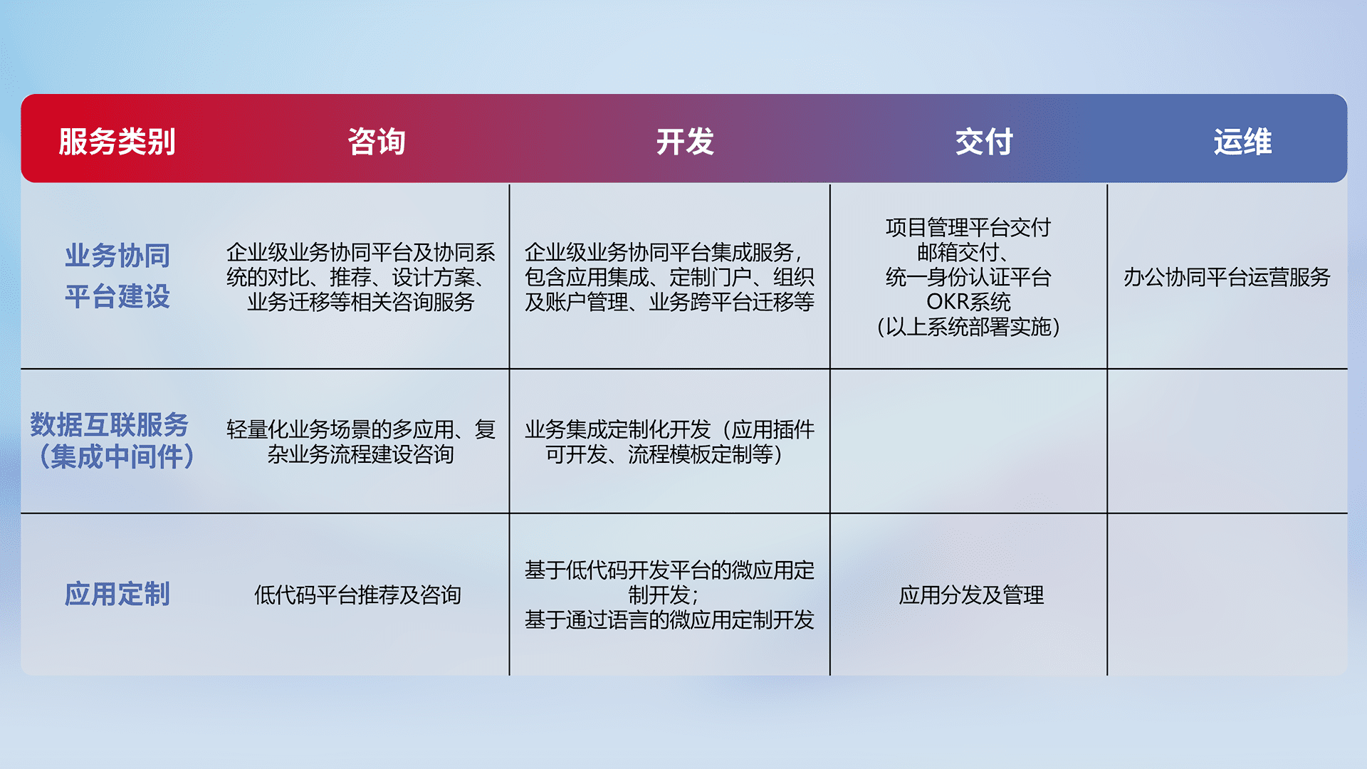 针对钉钉、、企微、、、IDaas等平台级产品提供产品的规划、、、、方案、、交付、、、、定制化开发等服务,,,实现如统一协同办公、、、智能客户服务、、、、混合会议管理、、智能数据查询、、等业务场景,,,实现数字化转型。。。。