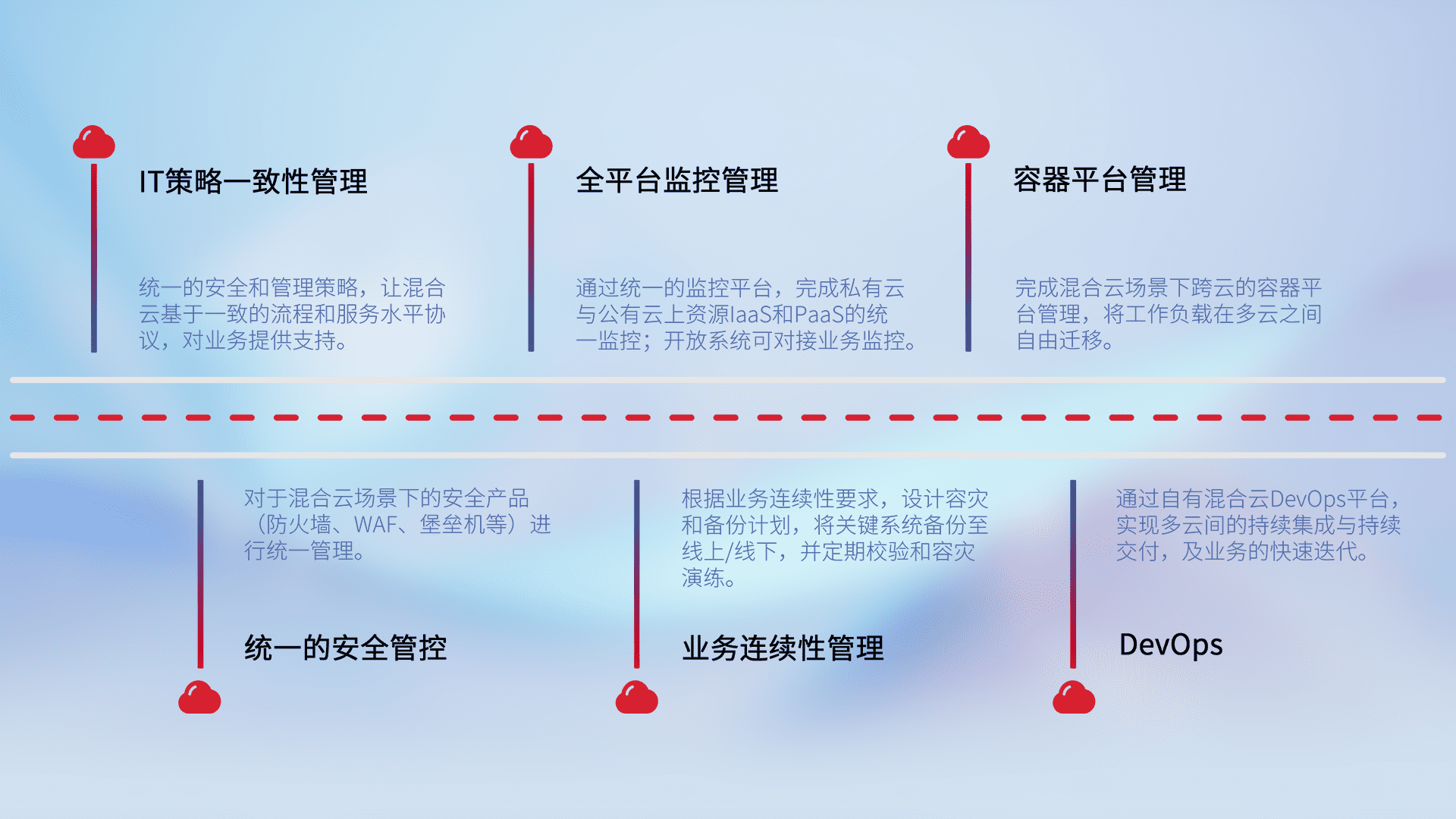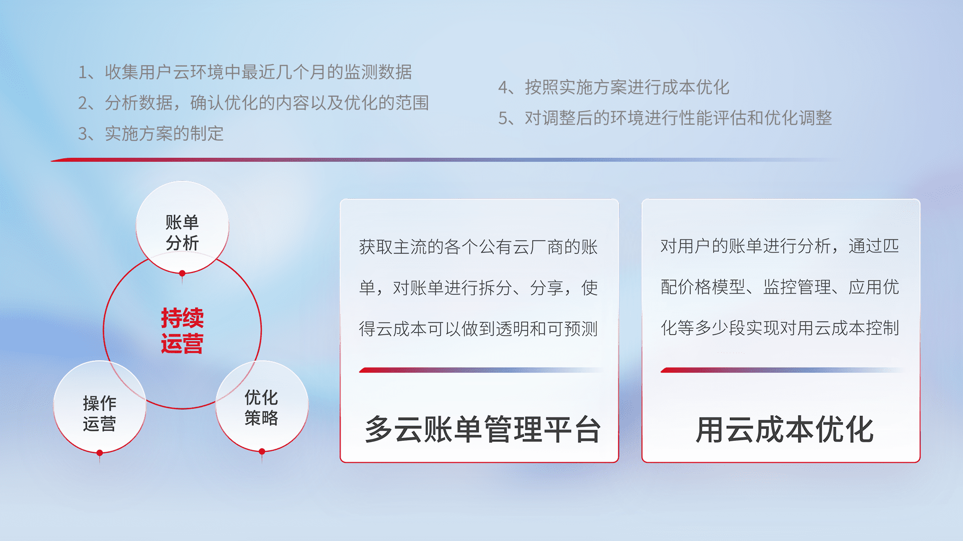 通过多云纳管,,,以统一的资源数据模型把客户的云资源进行抽象和封装,,,,进而实现对多云资源的统一操作,,保障云资源管理的可靠性、、、、稳定性与可用性。。量身定制化运维内容,,,配置、、、开发运维、、补丁管理、、、、备份、、、监控、、认证和访问管理、、、审计和日常巡检等,,,保障在用云过程中的可靠度,,,,稳定度以及高可用率。。。